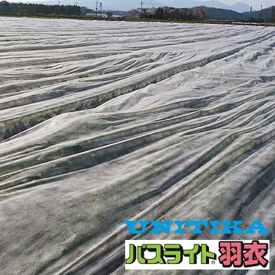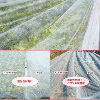 | 通気性を高め、春先の寒暖差から作物を守るべたがけシート「パスライト羽衣」。 昨今、春先の寒暖差が大きくなっておリ作物にとって大変厳しい環境となっています。 そこで、開発されたのがパスライト羽衣。保温性の高い素材「ポリエステル系複合長繊維不織布」で作られているので、夜間や早朝時の急激な冷え込みから作物を守ります。また、繊維を太くし間隙率を上げることで高い通気性を実現し、日中の高温時でもべたがけ内の熱を放出し作物を守ります。透光性が高いので、太陽光を遮らず作物に光を注ぎ、さらに通気性の向上により突風時のバタツキによる作物の痛みも軽減しております。パスライト羽衣は、新しい環境対応型べたがけ資材として作物の生育を快適にサポートいたします。 |
