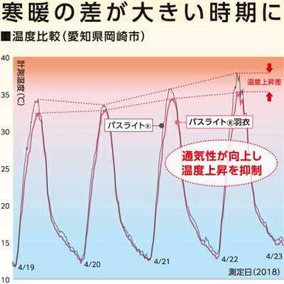 通気性を高め、春先の寒暖差から作物を守るべたがけシート「パスライト羽衣」。 昨今、春先の寒暖差が大きくなっておリ作物にとって大変厳しい環境となっています。 そこで、開発されたのがパスライト羽衣。保温性の高い素材「ポリエステル系複合長繊維不織布」で作られているので、夜間や早朝時の急激な冷え込みから作物を守ります。また、繊維を太くし間隙率を上げることで高い通気性を実現し、日中の高温時でもべたがけ内の熱を放出し作物を守ります。透光性が高いので、太陽光を遮らず作物に光を注ぎ、さらに通気性の向上により突風時のバタツキによる作物の痛みも軽減しております。パスライト羽衣は、新しい環境対応型べたがけ資材として作物の生育を快適にサポートいたします。 |