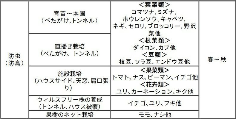 ビニロン(PVA)糸を使用しているクレモナ寒冷紗は防虫効果はもちろんのこと、1)遮光効果 2)蒸散 防止効果 3)保温効果 4)防風効果に優れ、そ菜類の育苗・トンネル栽培、台風対策に適しています。 クラレ クレモナ寒冷紗 #300 白 180cm X 100m 遮光率 約30% 農業資材 トンネル べたがけ 防虫 遮光 蒸散 保温 防風 そ菜類 育苗 台風対策