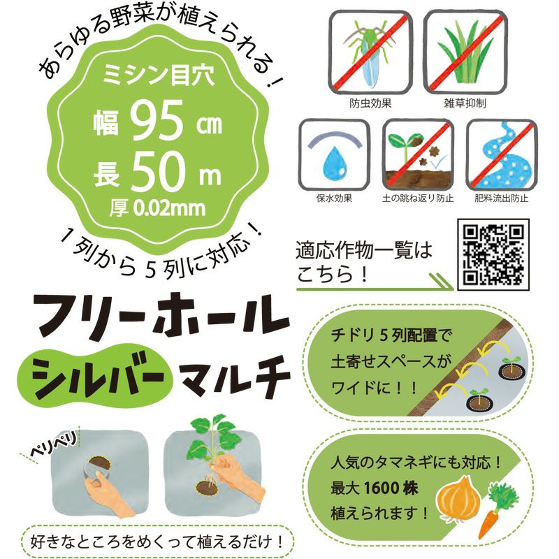 従来はウッドチップや藁などを利用して有機物での被覆を行うシーンが多く見受けられましたが、近年はマルチシートを利用した「マルチング」という栽培手法が主流で、地面の温度などが管理しやすくなるため畑の条件による生育の違いをカバーしやすく、家庭菜園でも人気の商品です。