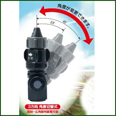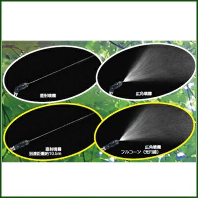 | ●先端部の角度を3方向に変えることができ、先端調整部を回すことにより(約1回転)、噴霧パターンを直射から広角に変えられます。(特許出願済) ●低圧力で遠距離散布ができます。 ●広角散布時の噴霧パターンがフルコーン(充円錐)のため、霧密度がアップします。 ●樹脂製のため、軽量です。 適応機種 ●人力噴霧機 ●バッテリー動噴 ●背負動噴(1MPa以下で使用できるものに限る) |