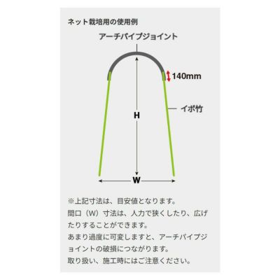 アーチパイプ 軽くて丈夫、誰にでも簡単にできるトンネル 収穫後は直柱として使用可能 支柱はイボ竹Rを使用 コンパクトに収納可能 用途 ネット栽培に(キュウリ、えんどう、いんげん、長芋等) 切り花のネット栽培に 雨よけ栽培に |