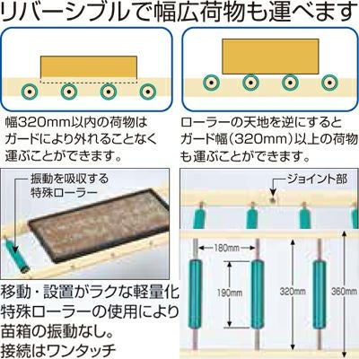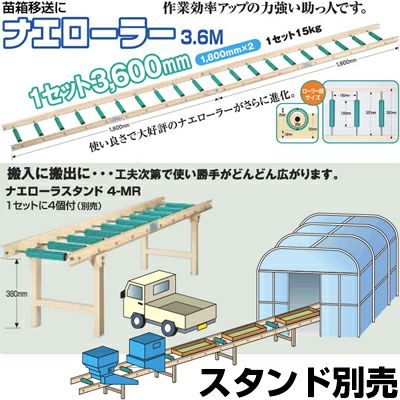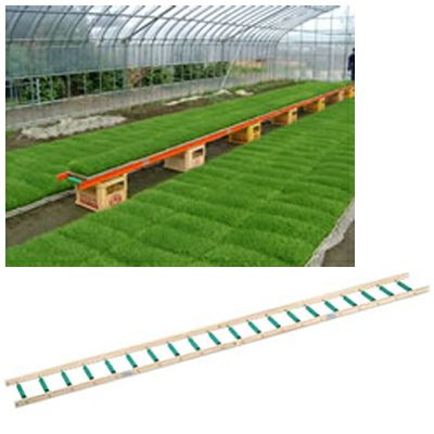 | 育苗箱などのハウス内の移動に、播種機から育苗機・ハウスへの送り出しにナエローラーが活躍します。 ローラーコンベアがあったら・・・ 米作りでの春作業で播種・田植えなどの時、重い苗箱を数枚持ってハウス内や播種機から移動するとき、ローラーコンベアがあったら便利ですよね。 でもローラーコンベアは価格が高いし重い・・・・そこでホクエツが作りました。 かるくて安価な樹脂ローラーを使った『ナエローラー』 ・播種機・土入れ機の後に取り付け苗箱を育苗器やハウスに搬送する ・ビニールハウス内に設置して苗箱を入れる時、出すとき使用する ・田植えのとき用水路などを越して育苗箱を移送する などなどアイデアしだいで苗箱や同程度の大きさ重さのものの移動に使用できます 。 作業効率アップの力強い助っ人です。 使い良さで大好評のナエローラーがさらに進化。 【製品特徴】 1.振動を吸収する特殊ローラー 2. 1.8mが2本で1セット(3.6m)、ワンタッチで何本でも接続できます。 3.移動・設置が楽な軽量設計 4.裏・表で育苗箱のガードつきでもなしでも使えます。 5.苗箱以外の移送にも使用できます。(育苗箱程度の重量のもの)大きさやローラーにあたる面の形状によっては使用できません。 6.リバーシブルで幅広荷物も運べます。 |