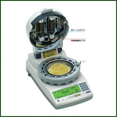 | FD-800はケツト科学の赤外線水分計シリーズの頂点に位置づけられる機器で、高精度な水分測定を実現するため画期的なデュアル温度センサ方式を採用しています。従来器はサーミスタによって乾燥チャンバー内の環境温度を計測し、加熱・乾燥温度の制御をしていました。サーミスタによる温度計測は長期の実績から安定し確立された方式です。しかしながら、より高精度な水分測定を要求する場合、環境温度に対する試料温度の追随性の問題や、試料の形状等によってヒータやサーミスタと試料間の距離を、常に同一にするのは構造的に困難であり、このバラツキが測定精度に悪影響を与えていました。そこで、本器はサーミスタに加え直接に試料温度を非接触で計測する放射温度計を搭載し、サーミスタの欠点を補完しつつ、試料特性に合せ最適な加熱・乾燥条件を設定することができ、試料を焦がしてしまったり変質させてしまうこともなく、測定時間の短縮と測定精度の向上が図られています。本器は高度な水分管理を必要とする品質管理部門や、検査部門の水分計として位置づけられ、高精度な水分管理に対応します。 FD-800赤外線水分計デュアル温度センサ搭載のフルスペックモデル。 ●高度な温度制御。 従来のサーミスタによる温度制御(T1)に加え、新たに試料温度を直接測定する放射温度計(T2)を採用し、両者のメリットを最大限に活用する高度な温度制御が可能となりました。 ●測定時間が短縮。 試料温度を直接測定することにより、試料を効率的に加熱することができ、測定時間を大幅に短縮することが可能となりました。 ●高精度な測定。 試料温度が測定できるため、試料の特性に合わせた最適な加熱条件の設定ができ、焦げや変質を回避し、より正確な水分測定が可能となります。 ●高精度アルミ一体型質量センサ「ユニブロック」 *1を採用。応答性、温度特性、対衝撃性に優れた信頼性の高い計量ユニット。 ●新方式のオートテア機構を採用。 天秤のゼロ点校正を自動的に取りながら測定を行うため、長時間の測定でも天秤ドリフトは補正され、高精度な測定が可能。 ● 熱源に中波長赤外線クォーツヒータを採用。 クォーツヒータ(最大エネルギー波長2.6μm)は広範囲の試料の乾燥効率に優れ、試料の色による差が出にくく、また試料面温度のオーバーシュートが無いため理想的な乾燥が可能。また、クォーツヒータの平均寿命は2?3万時間で、これは従来の赤外線ランプやハロゲンランプと比較し5?10倍の長寿命。 ●さまざまな測定要求に応える6種の測定モードを用意。 自動停止、時間停止、急速乾燥、緩速乾燥、ステップ乾燥、予測(比較)測定の6モードを備え、測定試料の乾燥特性に適した乾燥条件の選択が可能。 ● 測定条件(乾燥温度・測定モード)を100種、登録保存が可能。 測定条件保存エリアを備え、測定条件をこのエリアに登録することによって、測定準備がよりスムースに行なえる。 ●30秒間の水分変化量(ΔM)を数値とスケールで表示。 表示部に水分変化量(ΔM)を表示。終了時期の目安がつけやすく、また測定終了条件を決める際に有効。 ●オプションのデータ管理ソフトを用意。 パソコンと接続し、測定データをMSExcel *2互換のワークシート形式へ転送することが可能。 ●オプショナルプリンタに接続可能。 オプションのプリンタVZ-330接続し、測定途中の乾燥状態、最終測定値などをグラフ化しプリントアウトすることが可能。 ●放射温度計の校正が可能。 オプションで放射温度計校正セットGF-20を用意。 |