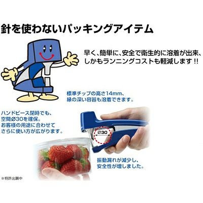 針を使わないパッキングアイテム 早く、簡単に、安全で衛生に溶着が出来、 しかもランニングコストも軽減します! |