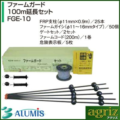 | アルミス FGE-10 ファームガード100m延長セット FRP支柱 【セット内容】 ・FRP支柱(φ11mm×0.9m)/25本 ・ファームガイシ(φ11~16mmタイプ)/50個 ・ゲートセット/2セット ・ファームコード(200m)/1巻 ・危険表示板 【梱包サイズ】 190×915×170 ※この商品は100m延長セットの為、電柵機本体は含まれておりません。 |