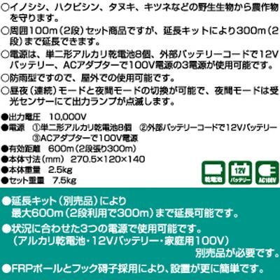 【特長】 ●イノシシ、ハクビシン、タヌキ、キツネなどの野生動物から農作物を守ります。 ●2段張り、周囲100mセットですが、別売の延長キットにより周囲300mまで延長できます。 ●防雨型ですので、屋外の使用が可能です。 ●昼夜(連続)モードと夜間モードの切り替えが可能で、夜間モードは受光センサーにて出力ランプが点滅します。 ※電源は、単2形アルカリ乾電池8個、外部バッテリーコードで12Vバッテリー、ACアダプターで100V電源の3種類が使用可能です。 |