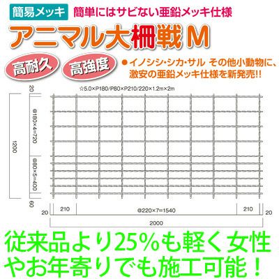 | セット内容 ・グローランド アニマル大柵戦 M120 1.2×2m 亜鉛メッキ:140枚 ・グローランド アニマル大柵戦用 支柱鉄筋 D12 1.5m 無規格 亜鉛メッキ:141本 ・グローランド アニマル大柵戦用 ステンレス結束線#18 L=350 1kg 約320本:2束 アニマル大柵戦は、イノシシ・シカなどの獣害から田畑を守る防獣用金網です。 従来のワイヤーメッシュの断面を四角にしてねじりを加えることによりさらに強く、軽量化を実現。 軽量化により、設置もさらにラクになりました。 亜鉛メッキ仕様でサビにくく、下部の網目を細かくしてありますので、小動物の侵入防止にも効果的です。安価で頑丈、高耐久性。 陽光をさえぎらず、風にも強く、設置も、交換や管理も簡単。 害獣対策に、コストパフォーマンス抜群!! ●軽いのに頑丈 従来のワイヤーメッシュの断面を四角にしてねじりを加えることによりさらに強く、軽量化を実現。 ●サビにくく長持ち 簡単にはサビない亜鉛メッキ加工。従来のフェンスより格段にサビにくく、長持ちします。 ●コストパフォーマンス抜群 コストを抑えて大量生産できる機械を開発したことにより、安価を実現。安価で丈夫、高耐久性。 イノシシ・シカ・サルもほか、下部の網目を細かくしてありますので小動物の侵入防止にも効果的です。 ●設置がカンタン 軽量化により、設置もさらにラクになりました。 陽光をさえぎらず、風にも強く、設置も、交換や管理も簡単。美観も損ねません。 角にRをつけているため、施工する際に手袋にひっかかりにくく、扱いやすくなっております。 |