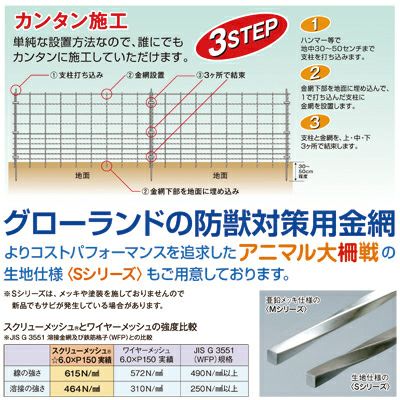 ●扱いやすく、どなたでも簡単に施工していただけます ●カンタン3ステップ 1.ハンマー等で地中30~50センチまで支柱を打ち込みます。 2.金網下部を地面に埋め込んで、1で打ち込んだ支柱に金網を設置します。 3.支柱と金網を上・中・下3カ所で結束します。 |