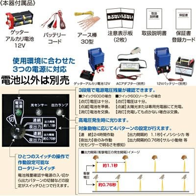 ・ゲッターアルカリ電池12V ・アース棒30型 ・バッテリーコード ・注意表示版(2枚) ・取扱説明書 ・保証書 |