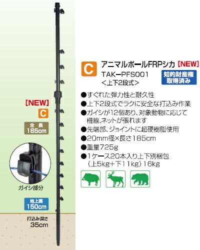 タイガー 電気柵用ポール 支柱 アニマルポール FRPシカ TAK-PFS001 【20mm径×長さ185cm】 【上下二段式】 20本入り 電柵資材 設置の手間が大幅に軽減!おすすめガイシ付支柱! 電気柵アニマルキラー専用FRP製支柱!獣害対策用電気柵資材に革命! 業界初!打ち込みがラクな「2段式」設置・撤収も驚くほどラク! 強くてしなやかなFRPポールでこれならシカも退散! ≪規格≫ 全長1850×直径20mm(地上部長さ:1500mm 埋め込み部長さ:350mm) 重量:725g 柵線取り付けフックの数:12個 ≪製品のポイント≫ ●打ち込み時に踏み台や脚立が不要!設置のわずらわしさカットと安全性を両立した業界初の2段式。 アニマルポールFRPシカは業界初の2段式という新発想で、作業をグンと簡単に。設置撤収に時間と人手が掛かりすぎていた今までのシカ対策の問題を一挙解決。打ち込みは低い位置で行えるため、脚立などに登る必要がなくラクで安全。農家の大切な作物を獣害からしっかり守ります。 ●FRP(ガラス繊維強化プラスチック)の強さとPR(ポリプロピレン樹脂)の柔軟性をあわせ持つ、強くてしなやかな高品質ポール。 高強度で軽量、しかも柔軟性に優れたFRP(ガラス繊維強化プラスチック)を芯材にし、耐候剤入りPR(ポリプロピレン)で成型。電気柵に最適な耐久性と柔軟性に優れたポールが実現しました。 ●ガイシ付きだから面倒なガイシ取り付け作業が不要。'めんどうくささ'から解放! ポールの打ち込みにくさと柵線取り付けの手間は電気柵設置のわずらわしさの原因。本品は柵線の取付の楽なガイシ付でスイスイ作業がはかどります。 ガイシはシカその他の獣害防止用としても最適な10cm間隔に設置。毎年の設置・撤収作業が楽々。コンパクトに収納できるので乗用車への積み込みもスムーズです。 ●先端部とジョイント部にポリカーボネートを使用するなど、様々な場所に対応するための工夫が満載! ワンタッチで柵線を取り付けられるガイシ、柵線が触れても漏電が起きない絶縁性の高い素材、打ち込んだ後のポールの回転を防ぐ先端部のリブなど、さまざまな工夫により特許権・意匠権を取得済。打ち込み時に衝撃を受ける先端部とジョイントにポリカーボネートを採用し、さらに耐衝撃性を高めた設計です。 ※こちらの商品に柵線やネット等は含まれておりません。 |