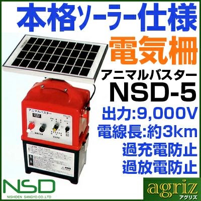 | セット内容 ・アニマルバスター NSD-5 (電気柵 本体) :1台 ・FRP支柱 φ14mm×900mm:90本 ・電柵用ヨリ線 ステンレス線3本入 250m:4本 ・ステンレスガイシ(フック) φ14mm :261個 ・ゲートグリップ:9セット ・5Wソーラーパネル:1個 ・5Wソーラーパネル用取付金具 ステンレス:1個 ・外付けバッテリー接続用コード:1個 安心安全設計!イノシシ、シカ、サル、クマ、小動物から大切な農作物を守ります! アニマルバスター NSD-5は、雑草や設置不備で漏電しても電圧が落ちにくい優れ物! ≪特長≫ ★入力電源のプラス、マイナス、逆接続保護回路付 ★スイッチの誤作動が少ないロータリースイッチ採用 ★プログラム暴走、誤作動対策を配慮した回路です ★入力電源により、適正な電池レベル位置を設定 ★電池確認残量は、『強』・『中』・『弱』の3段階表示 ★基板表面の撥水加工処理で湿度対策 ★圧電スピーカー内蔵、省電力で音でもお知らせ ※電池レベルが赤色になると、連続音(ピッ、ピッ、ピッ)が間隔を隔てて鳴り、電池交換時期を音でもお知らせします。 (出力時、待機時、共に連続音が鳴ります) ≪各部の名称とはたらき≫ ![]() ◎受光センサー 周囲の明るさを感知して自動的に、『昼のみ』『夜のみ』の出力動作を行います。 ◎出力ランプ 高電圧出力が作動している時は点滅し、作動していない時は点滅しません。 ◎電源スイッチ 電源を入り切りするスイッチです。上方向で入り、下方向で切れ、すべての機能が停止します。 ◎電池確認ボタン 電池レベル確認ボタンです。電池電圧により残量『強』は緑色、『中』は黄色、『弱』は赤色に点灯します。 ◎切替スイッチ 『連続』 昼夜連続で作動します。 『昼』 明るくなる昼間のみ作動します。 『夜』 暗くなる夜間のみ作動します。 ◎アース端子 付属されているアース棒に連結されているアース線の丸型端子を接続します。 ◎出力端子 付属の高圧線丸型端子をつないで、電柵線に高電圧を流します。 注意※出力端子、アース端子、取付け時は必ず電源を切にしてから行ってください。 注意※電源端子(乾電池・バッテリー)を接続するときは、+-を逆に接続しないでください。(作動しません) |