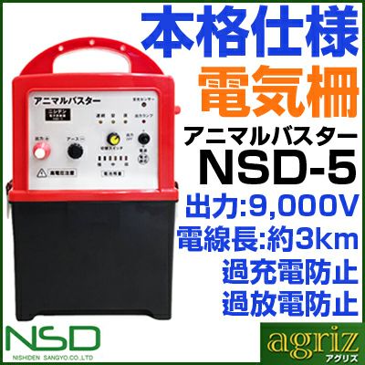 | セット内容 ・アニマルバスター NSD-5(電気柵 本体):1台 ・FRP支柱 φ14mm×900mm:90本 ・電柵用ヨリ線 ステンレス線3本入 250m:3本 ・ステンレスガイシ(フック) φ14mm:186本 ・ゲートグリップ:6セット 安心安全設計!イノシシ、シカ、サル、クマ、小動物から大切な農作物を守ります! アニマルバスター NSD-5は、雑草や設置不備で漏電しても電圧が落ちにくい優れ物! ≪特長≫ ★入力電源のプラス、マイナス、逆接続保護回路付 ★プログラム暴走、誤作動対策を配慮した回路です ★入力電源により、適正な電池レベル位置を設定 ★電池確認残量は、『強』・『中』・『弱』の3段階表示 ★基板表面の撥水加工処理で湿度対策 ★圧電スピーカー内蔵、省電力で音でもお知らせ ※電池レベルが赤色になると、連続音(ピッ、ピッ、ピッ)が間隔を隔てて鳴り、電池交換時期を音でもお知らせします。 (出力時、待機時、共に連続音が鳴ります) ≪各部の名称とはたらき≫ ![]() ◎受光センサー 周囲の明るさを感知して自動的に、『昼のみ』『夜のみ』の出力動作を行います。 ◎出力ランプ 高電圧出力が作動している時は点滅し、作動していない時は点滅しません。 ◎電源スイッチ 電源を入り切りするスイッチです。上方向で入り、下方向で切れ、すべての機能が停止します。 ◎電池確認ボタン 電池レベル確認ボタンです。電池電圧により残量『強』は緑色、『中』は黄色、『弱』は赤色に点灯します。 ◎切替スイッチ 『連続』 昼夜連続で作動します。 『昼』 明るくなる昼間のみ作動します。 『夜』 暗くなる夜間のみ作動します。 ◎アース端子 付属されているアース棒に連結されているアース線の丸型端子を接続します。 ◎出力端子 付属の高圧線丸型端子をつないで、電柵線に高電圧を流します。 注意※出力端子、アース端子、取付け時は必ず電源を切にしてから行ってください。 注意※電源端子(乾電池・バッテリー)を接続するときは、+-を逆に接続しないでください。(作動しません) |