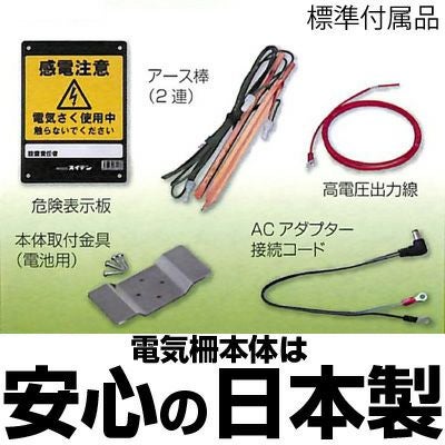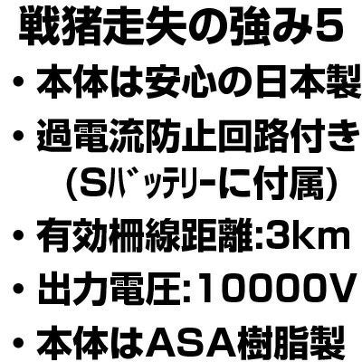 | 電気さく 戦猪走失(せんいそうしつ)ソーラーセット ●電気さく本機は信頼の「日本製」 ●有効柵線距離:3,000m ●小型で高機能 ●シールドバッテリーに過電流防止回路が付属 ●ソーラーパネル(5W) ●雨でも安心の防雨型 ●本体材質は耐候性に優れたASA樹脂を使用 ●盗難対策に本体横に南京錠を取付可能 ●運転モードは3段階切替:夜・昼・連続 【高圧出力電圧】:10,000V(無負荷時) 【本体寸法】:幅260×高さ321×奥行170mm 【本体重量】:2.4kg(電池含まず) |