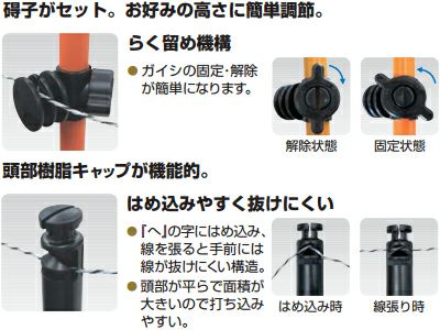 ●簡単固定可能な碍子付支柱。 ●頭部キャップも線張り可能。 ●先端は樹脂キャップ付き(座金入り)で硬い地面にも差し込めます。 ●視認性の高いオレンジ色で下草刈り時の誤った切断を防ぎます。 碍子がセット。お好みの高さに簡単調節。らく留め機構 ●ガイシの固定・解除が簡単になります。 頭部樹脂キャップが機能的。はめ込みやすく抜けにくい ●『へ』の字にはめ込み、線を張ると手前には線が抜けにくい構造。 ●頭部が平らで面積が大きいので打ち込みやすい。 ※この商品には電柵コードは付いておりません。 |