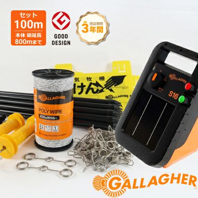 周囲100mx2段までのフェンスに必要なすべての使用部材が含まれ、詳細な説明書が添付されていますので、どなたでも簡単に電気柵を設置することができます。 【本体附属品】 ガラガーミニソーラー番兵S16x/1台 アースセット(3本)/1セット リード線(赤・フェンス用)/1本 リード線(緑・アース用)/1本 バッテリーケーブル/1本 説明書/保証書 【フェンス部分】(2段張り・100m分) ホワイトワイヤー(200m巻)/1巻 FRP支柱14型(900mm)/25本 クイッククリップ14型/50個 ゲートハンドル/2個 簡易ゲートアンカー/2個 簡易緊張具/2個 きけん表示板/2枚 ※段数を追加する場合は「架線段数追加資材キット(14型) 」、距離を追加したい場合は「100m延長用資材キット」をご利用ください。 |