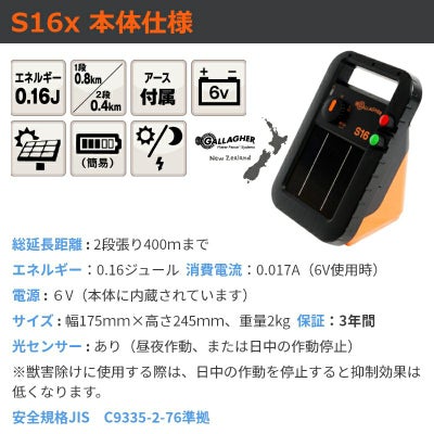 ・ソーラー、バッテリー、パワーユニットの一体型モデル ・落としたり荷台で飛び跳ねたり、いろいろな天候条件でも利用することなどを想定した優れた耐衝撃性と防水性 ・業界初の人工頭脳電気柵 環境を判断して出力を自動調整 ・電気効率を追求した省電力設計 ・梅雨など発電量が少ない時期も充電なしで2週間作動 ・バッテリーチェックランプ付 ・光センサーによるデイオフ機能(夜間のみの作動が可能) |