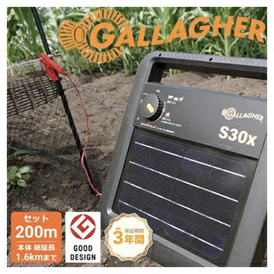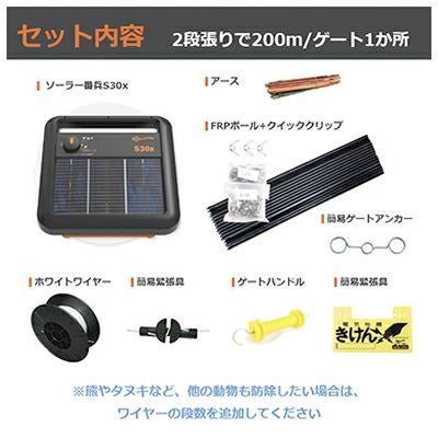 周囲200mx2段までのフェンスに必要なすべての使用部材が含まれ、詳細な説明書が添付されていますので、どなたでも簡単に電気柵を設置することができます。 【本体附属品】 ガラガー番兵S30x/1台 ※S30xの取り付け用ポストは付属しておりません。Y型ポスト800mm(S16x取付用ポスト)などをご用意ください。 アースセット(5本)/1セット リード線(赤・フェンス用)/1本 リード線(緑・アース用)/1本 説明書/保証書 【フェンス部分】(2段張り・200m分) ホワイトワイヤー(400m巻・ボビン付)/1巻 FRPポール14型(900mm)/50本 クイッククリップ14型/100個 簡易ゲートハンドル/2個 簡易ゲートアンカー/2個 簡易緊張具/4個 きけん表示板/4枚 ※距離を追加したい場合は「100m延長用資材キット(9765)」をご利用ください。 |