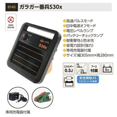 ガラガー番兵S30x -高速パルスモード -日中電源オフモード -電圧レベルランプ -バッテリーチェックランプ -耐衝撃性と防水性 -省電力設計(強力) -専用充電器付属 -サイズ:幅305mm×高280mm |