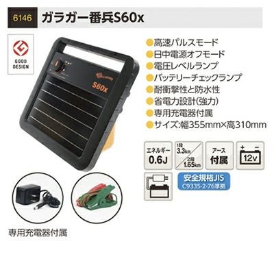 ガラガー番兵S60x -高速パルスモード -日中電源オフモード -電圧レベルランプ -バッテリーチェックランプ -耐衝撃性と防水性 -省電力設計(強力) -専用充電器付属 -サイズ:幅355mm×高310mm |