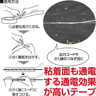 さく線のつなぎ目などの補強・通電効率アップに最適なテープです。粘着面もしっかり通電するため通電効果が高いです。さらに手で簡単に切れるので剥がすときも手早く取り外せます。
