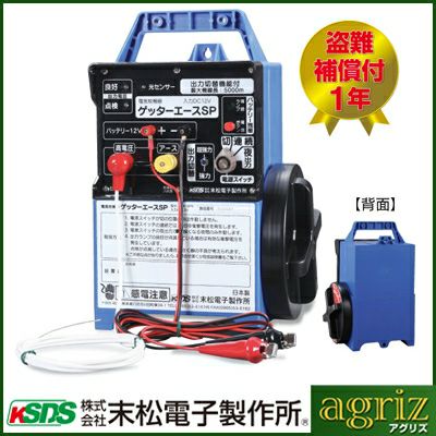 | セット内容 末松電子 電気柵 ゲッターエースSP ACE-SP5×1台 末松電子 電気柵 資材 自在取付支柱セット×1式 末松電子 電気柵 資材 バッテリーボックス GB12-3×1個 末松電子 電気柵 ゲッターエースSP ACE-SP5 電柵本体 電気牧柵 ≪特長≫ 1.漏電にも強いタイプで、大型の害獣にも効果を発揮します。 漏電にも強い強力タイプ! 2.対象の害獣によって強力・超強力が選べる出力切替スイッチ付。 2段階の出力切替スイッチ!通常は『超強力』でお使い下さい。 ≪仕様・寸法≫ 電源:DC12V(バッテリー別売) 電線長:2段張りの場合 周囲約2500m 電線長:3段張りの場合 周囲約1666m 電線長:4段張りの場合 周囲約1250m 電線長:5段張りの場合 周囲約1000m 最大出力:10000V 本器サイズ:高さ約355mm×幅約235mm×奥行約192mm 重量:約3.2kg ≪付属品≫ ・バッテリーコード ・アース棒45型(1本) ・注意表示板(2枚) ・取扱説明書(1冊) ・保証書/登録カード(1枚) ※取扱説明書をよく読んで正しくお使いください。 ※こちらの商品には柵線・支柱等とバッテリーは含まれておりません。 |