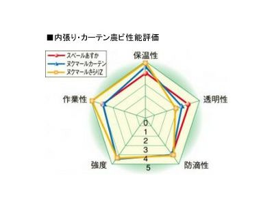 | さらにベタつきをなくし、作業性をプラスした内張り・カーテン用農ビ。 保温性と作業性を考慮し、ベタツキをなくし保温性をアップしたハウス内のトンネル、カーテン専用農ビです。 ●優れた防適性・透明性。 ●高い保温性。 ●ベタつかず作業性向上。 |