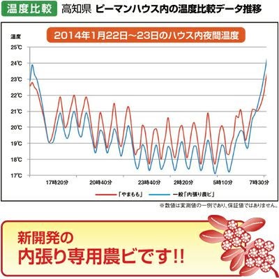 | 保温性、透明性、作業性を強化した内張り用高性能農ビです。厚さ0.05mmで0.1mmと同等の高い保温性が特長です。高い保温性を維持しつつフィルムの光線透過率を高めることで高透明性を確保したことにより、植物の生育を妨げることなく、高品質な農産物を作る栽培環境を整えることができます。 |