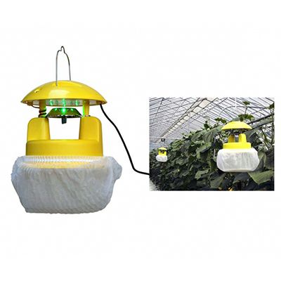 ハウス内に設置し、LEDの光で害虫を誘引・強力吸引ファンで捕獲! 本機は、ハウス内へ400~500㎡に1台を目安に設置し、紫外線・UV(375nm)と可視光線・緑色(525nm)のLED光を用いた飛翔害虫用防除機です。 飛翔害虫をLED光で誘引し、強力吸引ファンで専用捕虫袋に集めます。 ●本器はLED光で害虫を誘引。反射板でLED光を拡散。 LED光は従来品(CLF-510)6球から12球に増やし、捕虫率向上。 ●捕虫には使い捨ての剪葉捕虫袋を使用、取付や処分が簡単。 ●防滴型(ACアダプターを除く)のため、上方からの散水など、水がかかる場所でも使用可能。 ●栽培を始める前に設置すると、害虫の抑制効果が向上。 |