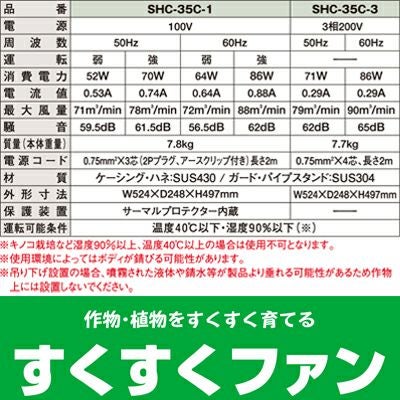 | ボディは、サビや腐食に強いステンレス製 耐久・安全性を重視した、全閉型モータを採用 すくすくファンの効果とは。 微風をハウス内に循環させる事により、葉面下の炭酸ガスを効率よく循環させ、作物の光合成を促進させます。 葉と葉の接触刺激により徒長を抑え均一な生育が出来ます。 空気攪拌をする事により、硫黄くんえん、炭酸ガス発生装置、農薬くん蒸の効果が大幅にアップします。 ●夏場の高温対策 空気を循環させることにより温室内の温度ムラを解消し、夏場の局所的な高温状態を改善する効果があります。 ●冬場の暖房の効率化 温室上部にある暖かい空気を下の方に循環させることにより、暖房の効率化が図れます。 ●梅雨時・冬場における空気の淀みを解消 梅雨時・冬場締め切った温室の空気の淀みを解消し、病害を防ぐ効果が期待できます。 ●「葉面境界層」の破壊による光合成の促進と病害の発生防止 作物の表面にできる葉面境界層(高湿度層)を循環する空気の流れで破壊し、作物の光合成を促進し病害を防ぎます。 ※葉面境界層とは葉周辺の空気の流れが少なく、高湿度な空気が葉の表面に淀んだ状態をいいます。 ●接触刺激による徒長(作物の葉・茎が無駄に伸びること)の防止と生育の均一化 空気の流れにより葉と葉が接触し、接触刺激による徒長防止と生育の均一化が図れます。 |