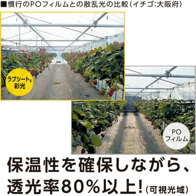 「ラブシート、彩光」は内張り用カーテン資材の定番「スーパーラブシート、FX」をベースに機能性を加え、保温性を保ちながら太陽光を80%以上(可視光域)透過し、散乱させます。天井はもちろんサイドにも設置することで、夜間は冷えから守り、日中ではやわらかな光を届け、作物の成長をサポート。通気性・蒸散性にも優れているので結露水が溜まりにくく、さらっとした清潔な表面感を保ちます。