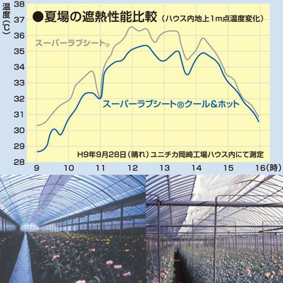 | 紫外線対策や保温性など、求められる機能を高いレベルで実現しました。 農業用不織布資材のトップメーカーとして、健やかな作物の育成を多方面からサポートいたします。 夏場の遮熱、冬場の保温機能を備えた「スーパーラブシートクール&ホット」。「スーパーラブシートクール&ホット」は、夏場の温度上昇を抑制し、冬場の暖房効果を高めるハウス用の内張りカーテン資材です。特殊加工で施した真っ白な樹脂が夏場に熱を反射し、ラブシートが冬場にあたたかさを保ち結露を防止。省エネ効果が期待でき、また重油使用量の軽減やCO2排出の抑制などエコ効果も期待できます。耐候性にも優れ、全光線透過型フィルムの下でも長期展張が可能で、1年を通しての使用にも対応。ハウス内の良好な環境づくりに、ぜひお役立てください。 夏も、冬も、快適。 【特長】 ●夏場での遮熱効果、冬場・夜間での保温性があります。 ●繊維構造タイプなので、除湿性能があります。 ●寸法安定性が良く、伸縮しません。 ●耐候性があり長期展張が可能です。 ●省エネ効果、また重油使用料軽減によるエコ効果が期待できます。 |