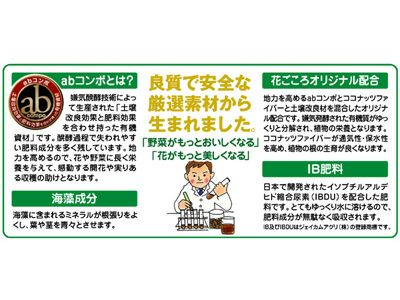 | 花も野菜も上手にできる ●地力を高めるabコンポを配合しました。 ●効き目が穏やかで肥効期間が長い、IB肥料を配合しました。 ●海藻成分のミネラルとカルシウムの効果で、根張りをよくします。 |
