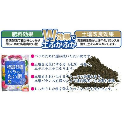 | ●バラのために選び抜いたたい肥です。 ●土壌を元気にする力(地力)が強く、土がふかふかになります。 ●また土壌をきれいにするデトックス効果もあり、土壌バランスを保つことで連作障害にも効果を発揮。 ●しっかりした根を張るきれいなバラを咲かせます。 |