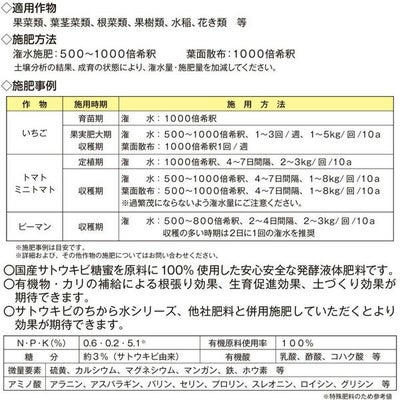 | 有機原料100%使用、葉面散布1000~1500倍施肥による草勢促進、収量増加、糖度増加の効果が高くなります。 活性剤(栄養補給)としての効果もあります。 |