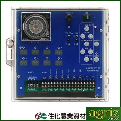 | 応用力抜群の潅水タイマー。 潅水/液肥施用の自動化を目的とする給液用タイマーです。 製品特性 ●系統毎に潅水と施肥の切替が可能です。 ●設定可能な潅水時間は、分/秒モードの場合は6秒~9分54秒、標準モードの場合は1分~99分です。 ●2電源仕様なので、単相100V/200Vの選択が可能です。 ●DC24V仕様の電磁弁の制御装置です。 |