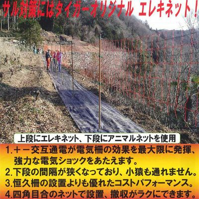 | プラス、マイナス交互通電が電気柵の効果を最大限に発揮、強力な電気ショックをあたえます。 下段の間隔が狭くなっており、小猿も通れません。 恒久柵の設置よりも優れたコストパフォーマンス。 四角目合のネットで設置、撤収がラクにできます。 ネット式なので、柵線のたるみやすり抜けを防ぎます |