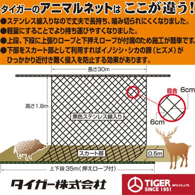 | ステンレス線入りなので丈夫で長持ち、噛み切られにくくなりました。 軽量にすることでより持ち運びやすくなりました。 上段、下段に上張りロープと下押えロープが付属のため施工が簡単です。 下部をスカート部として利用すればイノシシ・シカの蹄(ヒズメ)がひっかかり近付き難く侵入を防止する効果があります。 |
