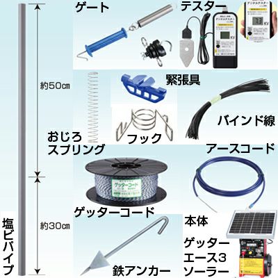 | 沖縄県、北海道、離島地域への配送は不可となります。 セット内容 グローランド NEOスクリューメッシュフェンス 線径5mm 網目10cm 1×2m 亜鉛メッキ : 105 枚 グローランド 支柱鉄筋(寸切り) D13 1.5m 無規格 亜鉛メッキ : 110 本 グローランド ステンレス結束線#18 L=350 1kg 約320本 : 2 束 末松電子 電気柵 本体 ゲッターエース3ソーラー ACE12-3S : 1 台 ・ゲッターパックL ・アース棒30型 ・バッテリーコード ・注意表示板(2枚) ・取扱説明書 ・保証書/登録カード 末松電子 塩ビパイプ 80cm (おじろ用心棒) : 109 本 末松電子 22mmフック (おじろ用心棒) : 436 個 末松電子 おじろスプリング 22mm (おじろ用心棒) : 327 個 末松電子 バインド線 40cm (50本束) : 5 束 末松電子 電気柵線 (コード) ゲッターコード 200m巻 : 4 巻 末松電子 アース接続コード 2.5m : 1 個 末松電子 出入口用 ゲート3型大 : 4 個 末松電子 緊張具 (コードのたるみ調整用) : 4 個 末松電子 検電器 デジタルテスター : 1 台 末松電子 鉄アンカー(メッキ加工、返し付き) 長さ30cm : 105 本 |