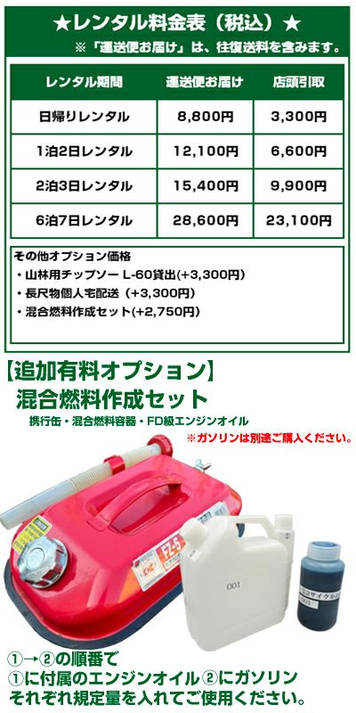 | 混合比 | ゼノア純正オイル(FD級)使用時50:1/ゼノア純正オイル(FC)使用時40:1 |