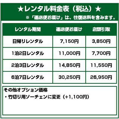 【レンタル品詳細】 ・取り扱い説明書 ・チェンソー本体 ・ソーチェン ・チェンオイル(1L) ※燃料は含まれておりません。 |