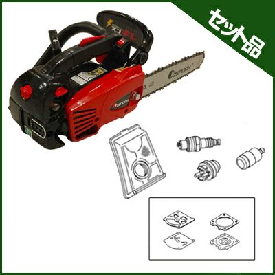 ~セット内容~ ゼノア G2200T-10PH00×1台 純正プラグ×1個 エアエレメント×1個 フィルタアッセン×1個 フライマリポンプアッセン×1個 ダイヤフラム・ガスケットキット×1個 基本の消耗品に加え、キャブレターオーバーホール用キットと比較的傷みやすいフライマリポンプなどの消耗部品が付いた便利なセットです。 本格的なメンテナンスができますが、一定の修理技術を必要とします。 「世界一軽い。」と言われるだけでは物足りない、ゼノアのこがるminiスゴキレ誕生。 ハイブリッドエンジンケース方式(マグネシウムクランクケース)の採用と、クラッチの軽量化により、チェンブレーキ標準装備ながらクラス最軽量を実現していたG2000シリーズがモデルチェンジ。 排気デコンプ無しの高圧縮のエンジンを搭載した、パワー重視のモデルとなります。 給排気系を見直し、クラッチドラムを従来の8枚刃から7枚刃に変更することにより出力アップを図ることで回転が落ち難く粘り強さが向上。10インチバーにも十分対応が可能になりました。 このサイズでありながら装備も抜かりありません。 ハンドルとタンクの一体化しエンジン部と分離することで振動の伝わりを軽減、作業者の負担を軽減します。 また、新ダストフリーシステムの採用で、よりきれいな空気だけをキャブレタに供給することでエアクリーナーのメンテナンス頻度が下がります。 エアーフィルタの清掃も工具レスで手軽に出来るのでわずらわしい分解作業が必要ありません。 チェンブレーキももちろん標準装備です。 非常に軽く滑らかな切れ味を持つハスクバーナ純正25AP互換チェーンのH00チェーンと10インチ(25cm)のスプロケットノーズバーの組み合わせとなります。 軽さだけでなくパワーも追求したG2200T。コンパクト設計のため立ち木伐採のような作業は苦手ですが、直径20cm程度までの枝打ちや玉切り作業であれば上位クラスの機種と遜色なくお使いいただけます。 パワー重視のG2200Tであれば10インチバーでのご使用もOK。切断スピードを重視される方には8インチバー仕様をおすすめいたします。手軽に手鋸がわりに使える1台となっております。 |
