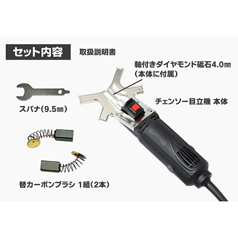 軸付きダイヤモンド砥石4.0mm 1本(本体装着済) スパナ(9.5mm) 替カーボンブラシ 1組(2本) |