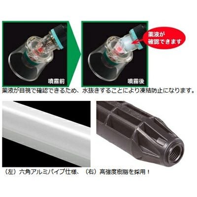 | 六角アルミパイプを採用!強度アップ且つ軽量に! ●本体は六角アルミパイプを採用し、強度のアップし且つ軽量になりました。 ●フードとエルボが透明なため、通過する薬液が見え、凍結防止のための水抜きが目視で確認できます。また、手元のグリップには高強度樹脂を採用しています。 ●ノズルや調整部(樹脂内部)は磨耗に強いステンレス製です。 ●DLC※1をノズルにコーティングし、耐磨耗性を向上させました。(従来品比※2:約3倍)(特許品) ●霧は手元のグリップを回すことにより、狭角から広角に変えられ、扇形に広がるためムラなく散布できます。 ●緩みを防止するロックキャップとロック付き袋ナットを採用しています。(特許品) ※1 DLCとは、ダイヤモンド・ライク・カーボンの略称で高硬度、耐磨耗性などダイヤモンドに近い特性を持つカーボン膜です。 ※2 当社従来品アルミズームαとの比較において、200時間噴霧後におけるノズルの磨耗率の違いにより算出。 |