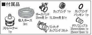 | 付属品 | ストレーナー:1個 吸入ホース:3m ホースバンド25mm:3個 ホースバンド15mm:1個 ホースバンド20mm:1個 カップリングクミ25×15mm:1セット タケノコニップル25×20mm:1個 ワンタッチカップリング:2セット |