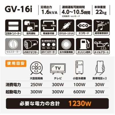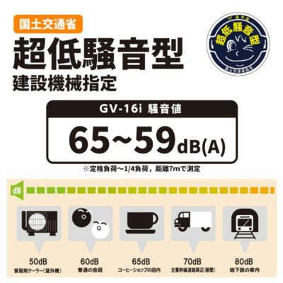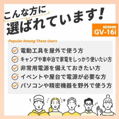 | 静かな運転音で使いやすい ●低騒音&低振動 PC:静かな運転音で使いやすい。 (一般的な会話:59dB~65dB) ※1:7m、1/4負荷~定格負荷 エコモード時 ●パソコン使用OK PC:高品質な電源なので精密機器でも安心して使えます。 家庭用のコンセントと同じように使えます。 ●シガーソケットも使える 車で使用しているシガーソケット端子付機器が使用できます。 ●連続運転 10.5~4時間 ※1/4負荷・エコモード使用~定格負荷時 ●コンパクト 軽量22kgのコンパクトボディ ●操作簡単 カンタン操作だからはじめて使う方でも安心 |