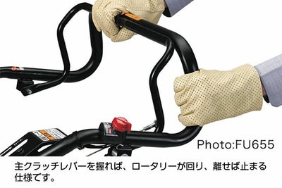 | Honda耕うん機トップの広い耕幅とパワー。 デフ付 リアロータリー式 直進性に優れ、パワフルに土を細かく砕いて、プロ顔負けの仕上がり。 ●耕うんラクラク、前進スムーズ 〈同軸・同時〉正逆転ロータリーの採用により、爪が土にしっかり食い込み、機体の飛び出しが少なく安定して耕うん。土だまりをつくらず美しく仕上げます。 ●土を格納して細かく粉砕 耕うん爪を覆うカバーの中に土を格納してかき回し、きめ細やかな土に仕上げます。 ●作業中、足もと安心 人と耕うん爪の間にリアシールドを装着することで作業も安心。さらに、耕うんした土を平らに整地します。 ●扱いやすさに配慮したハンドル周り 安心設計のクラッチレバーをはじめ、ハンドルを握ったままクラッチレバーの操作が可能なループハンドル、直進・旋回を快適に行うデフロック機構を採用。 ●移動も駐車もラクラク 大型タイヤで軽快に移動。FU755は、レバー1本でタイヤをロックする駐車ブレーキ付。 |