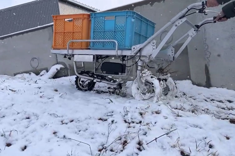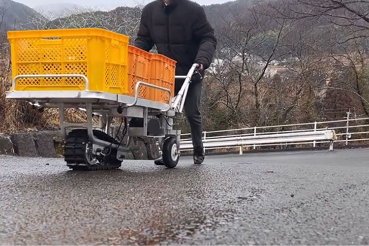電動運搬車はいろいろな機種が販売されていますよね。でもほとんどがタイヤタイプの物が多いと思います。舗装されている路面や整地されている場所、でこぼこが少ない場所であればそれでも良いのですが、でこぼこが多い不整地やぬかるみが多い場所、雪道といった足元が悪い場面では、タイヤがスリップしたり不安定になったりして、最悪は転倒といった危険もあります。
