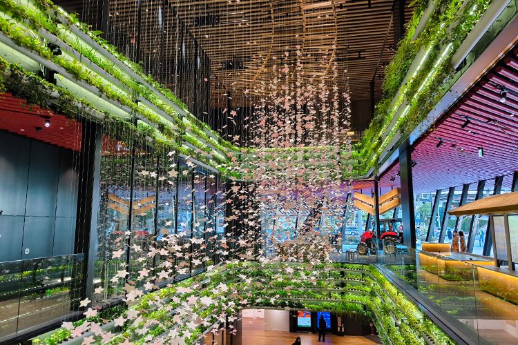 どうですか、このキラキラ感。 天井から降り注ぐ桜の花びらのような装飾と、壁一面に配置された鮮やかな緑。 僕らが普段目にする農機具の展示場や整備工場とは正反対の「超都会的」な空間なんです。
