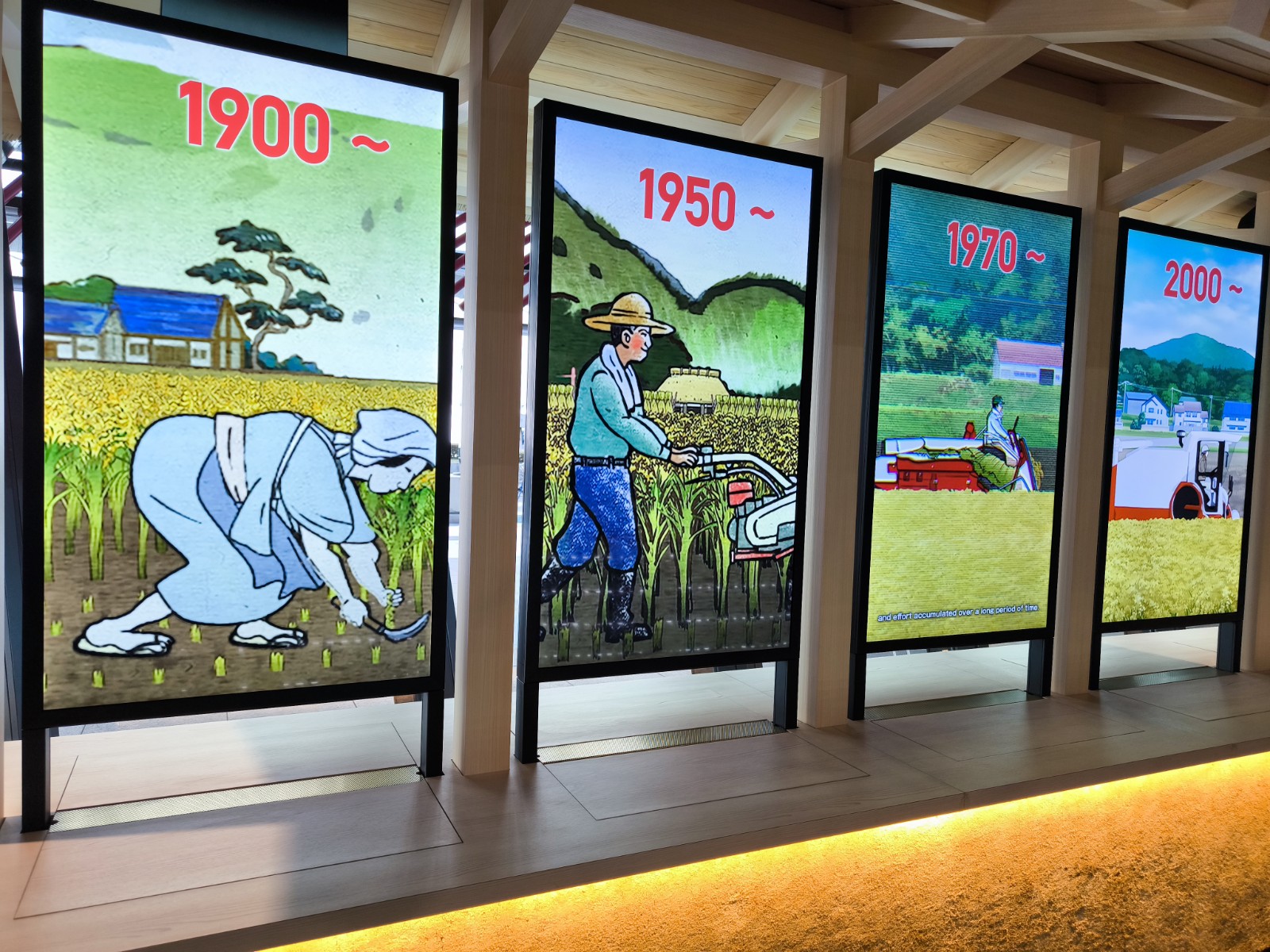 1900年代の手作業から始まり、現代のコンバインやトラクターへと進化していく過程がアニメで分かりやすく紹介されています。